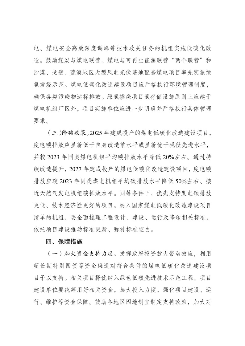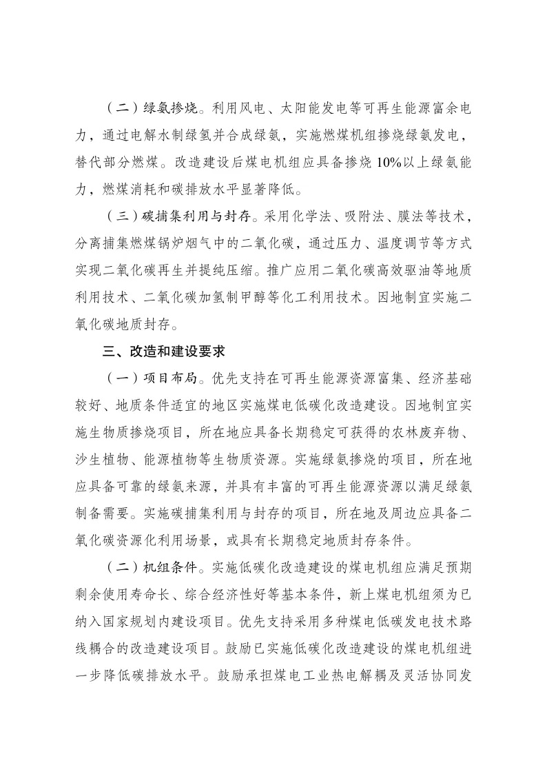 (二)機組條件。鼓勵承擔煤電工業熱電解耦及靈活協同發電、煤電安全高效深度調峰等技術攻關任務的機組實施低碳化改造。鼓勵煤炭與煤電聯營、煤電與可再生能源聯營“兩個聯營”和沙漠、戈壁、荒漠地區大型風電光伏基地配套煤電項目率先實施綠氨摻燒示范。煤電低碳化改造建設項目應嚴格執行環境管理制度,確保各類污染物達標排放。綠氨摻燒項目氨存儲設施原則上應建于煤電機組廠區外,項目實施單位應進一步明確并嚴格執行具體管理要求。